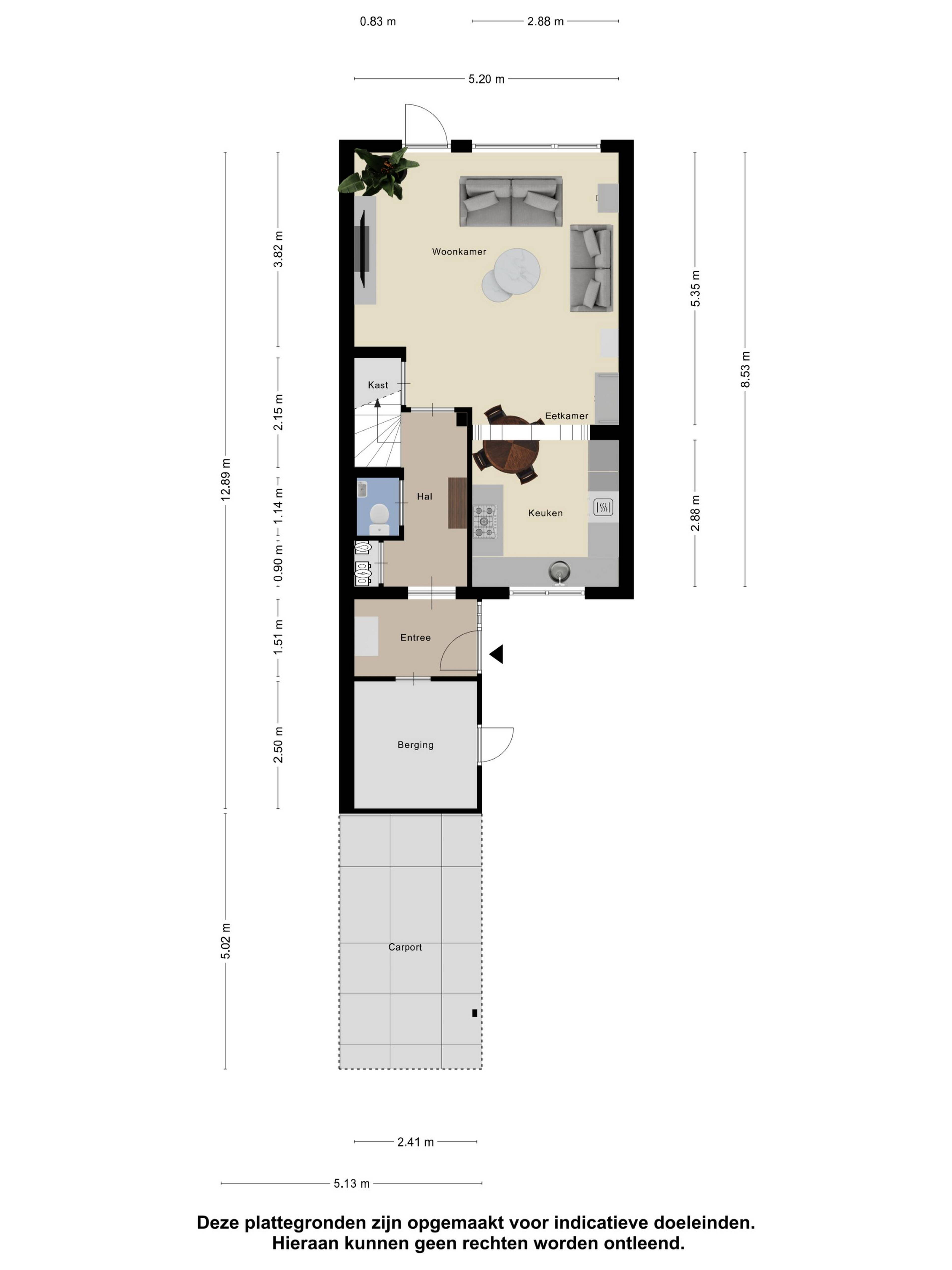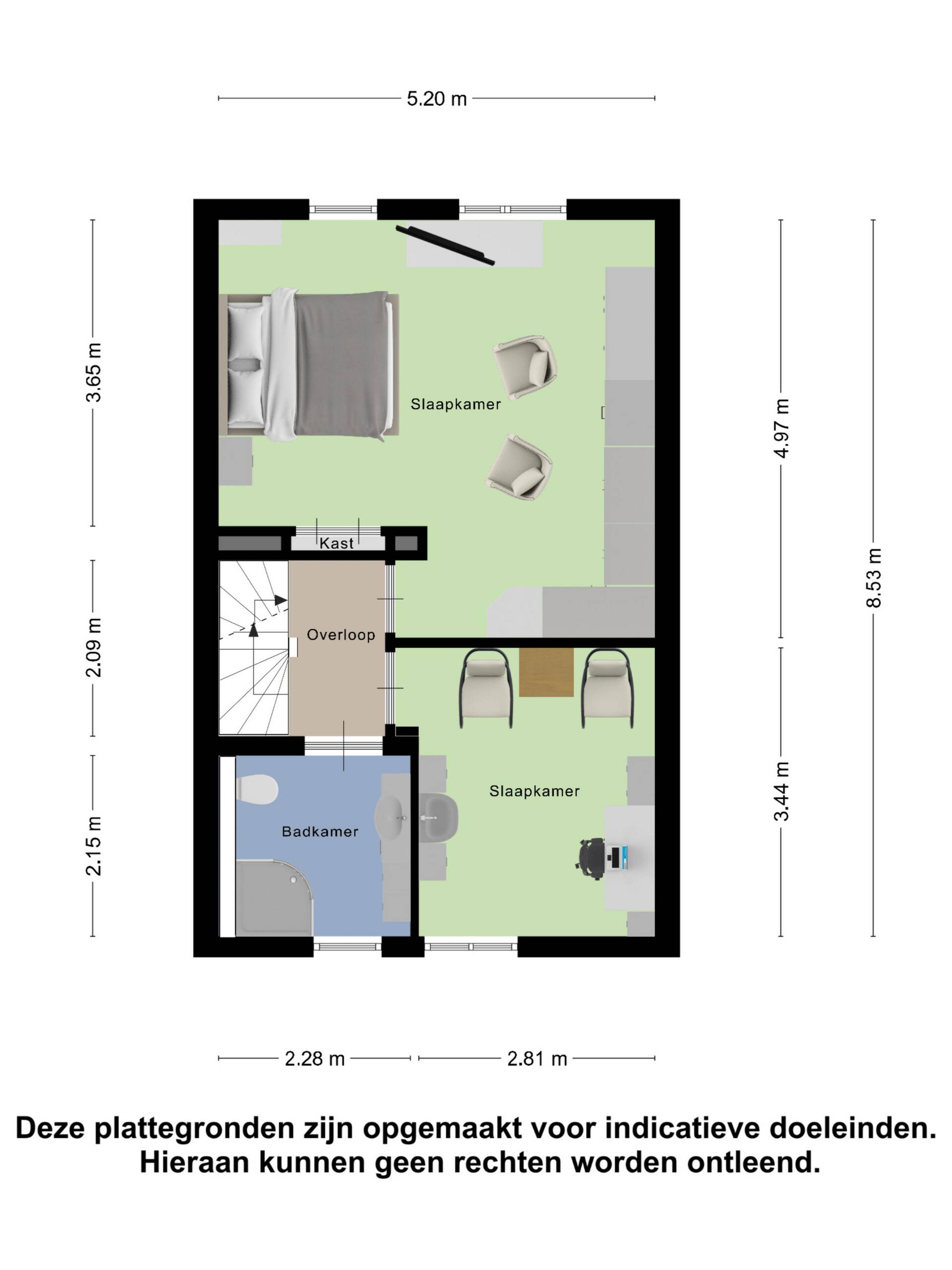 De trap vanuit de hal leidt u naar de eerste verdieping, waar twee ruime slaapkamers en een verzorgde badkamer zich bevinden. De indeling is praktisch en biedt veel mogelijkheden om de ruimtes naar eigen inzicht te gebruiken.