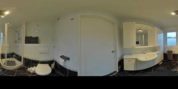 The bathroom is fully tiled and offers a modern feel. The spacious shower cubicle ensures optimal comfort, while the washbasin with storage space offers practical storage options. The floating toilet completes the bathroom and makes it stylish.