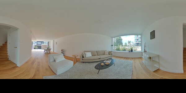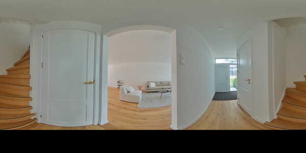 Once inside the cosy hallway, you are greeted by a calming combination of white walls with a wooden floor and luxurious details. This hallway provides access to the toilet, the staircase and the living room. The latter, together with the open-plan kitchen, covers almost the entire ground floor, leaving you with an enormous amount of living space. With a wall-to-wall window at the front and a luxurious looking glass sliding door at the rear, you are never short of light here during the day.