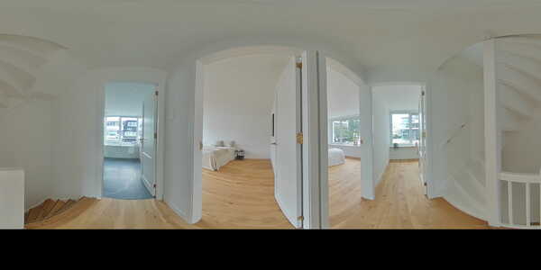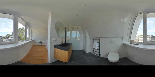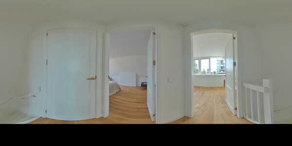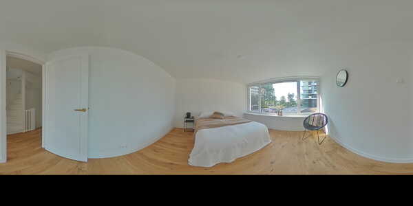 Boven op de eerste overloop tref je 2 riante slaapkamers aan, een werkkamer en de eerste luxe badkamer. De slaapkamer aan de achterzijde van het huis is het grootst, maar ze ontlopen elkaar niet veel. Alle kamers zijn voorzien van dezelfde strakke witte muren en eenzelfde houten vloer als de begane grond.