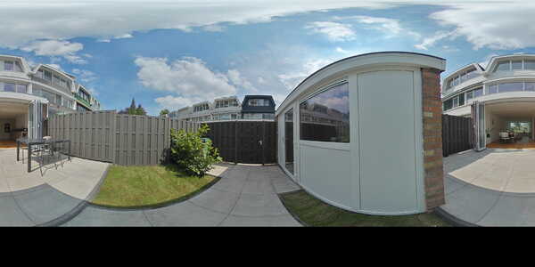 De zonnige tuin is grotendeels betegeld met grote, vierkante tegels. Te midden van het terras is echter een perkje vrijgehouden voor eventuele groene vingers. Daarbij tref je hier ook nog een eigen, stenen berging aan met nog meer opbergruimte.