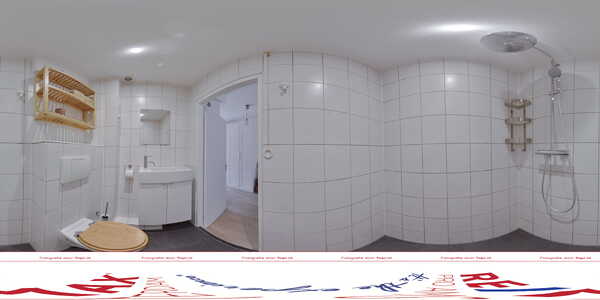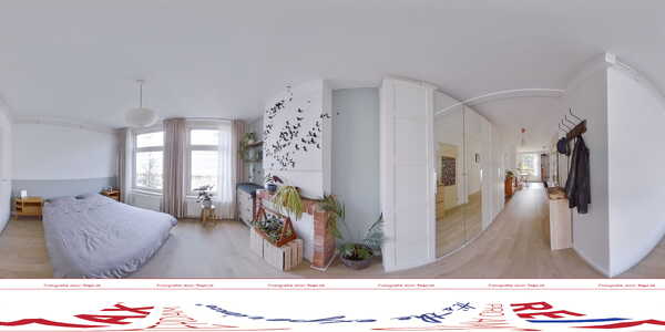 De slaapkamer bevindt zich aan de voorzijde en kan, net als de keuken, gemakkelijk tot een separaat vertrek worden gemaakt (zie de foto's voor een optie plattegrond). Hier vindt u twee grote raampartijen, een schouw en een inbouwkast met meterkast. De volledig betegelde badkamer is gesitueerd in het midden van de woning en biedt plaats aan toilet, hand- en regendouche en badkamermeubel met kastruimte en wastafel.