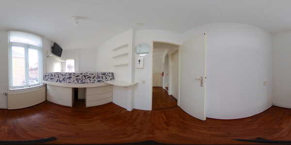 Through the second staircase you reach the landing which provides access to both bedrooms and the bathroom. The bedrooms are very spacious and feel comfortable because of the large windows. The bathroom has a shower, sink, toilet and plumbing for the washing machine.