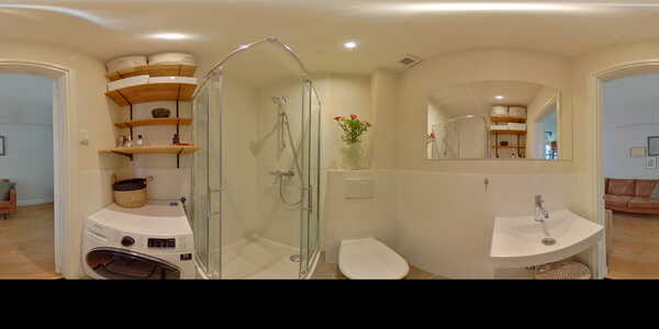 The bathroom is modern and nicely decorated with white and grey tiles. Here you will find a shower, toilet, sink and plumbing for the washing machine.