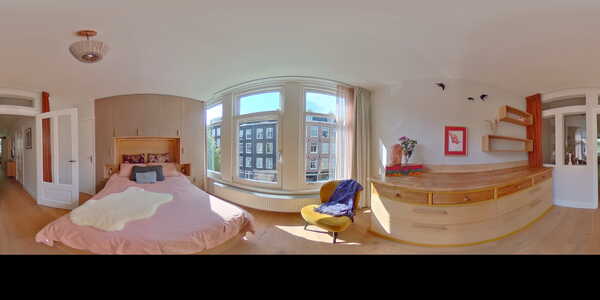 De slaapkamer is te bereiken via de woonkamer en heeft een prachtige lichtinval door de klassieke, grote ramen. Deze is ruim en biedt daarnaast genoeg opslagplek in de twee vaste kasten. Vanuit je slaapkamer kijk je dan ook uit op de Van Hogendorpstraat met zijn typische Amsterdamse woningen.