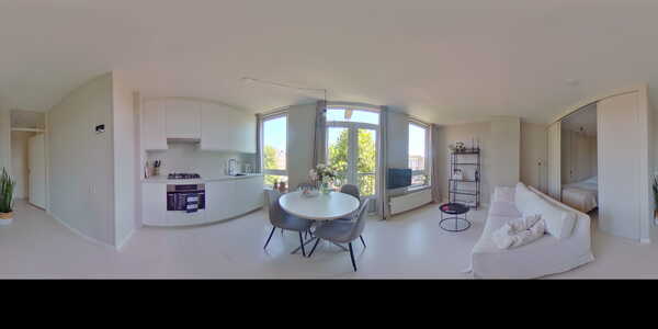 De woonkamer en open keuken zijn heerlijk licht dankzij de hoge ramen en witte vloer. Je kunt hier dan ook zowel heerlijk koken als eten met uitzicht. De keuken is al voorzien van enige inbouwapparatuur. Zo zit er een modern gasfornuis met afzuigkap in, een oven, een rechthoekige design wasbak met bijbehorende kraan en een vaatwasser