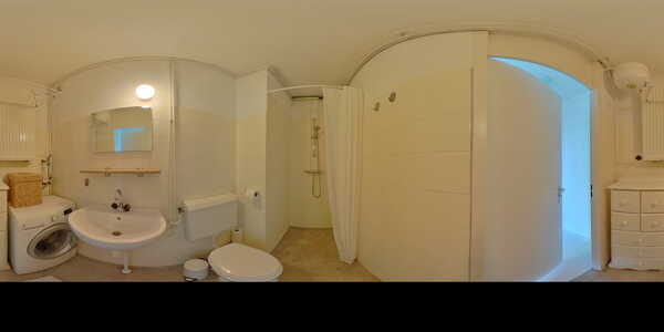 From the cosy hall you can go straight to the bathroom and the living room. The bathroom has a spacious walk-in shower, toilet and sink with mirror. You can also use the sink and power supply for your washing machine.