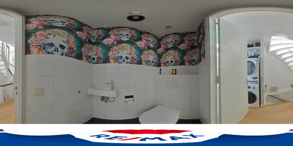The bathroom is modern and luxurious. Here you will find much comfort with fine bath, shower in bath and washbasin in designer furniture. The black and white tiles gives it a neat appearance. The separate toilet is equipped with the same style, which makes it a nice whole.