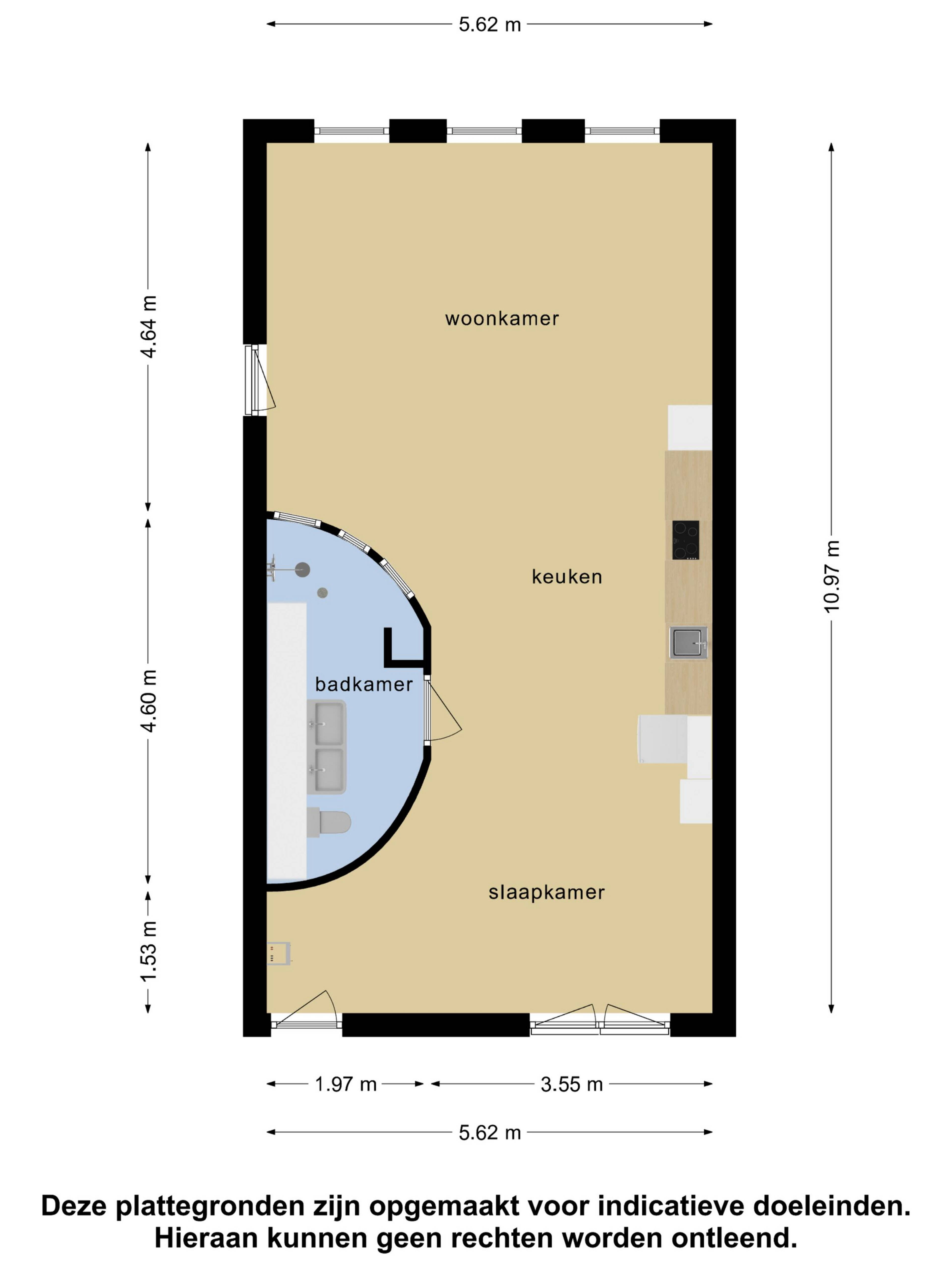 Het slaapgedeelte kenmerkt zich door veel lichtinval en openslaande deuren naar een Frans balkon. De badkamer is met zijn ronde wanden uniek van design. Deze is modern en geheel volgens trend ontworpen met witte metrotegels op de wand en zwarte hexagon tegels op de vloer. Hier ben je voorzien van zwevend toilet, regendouche en dubbele wastafel in fraai meubel.
