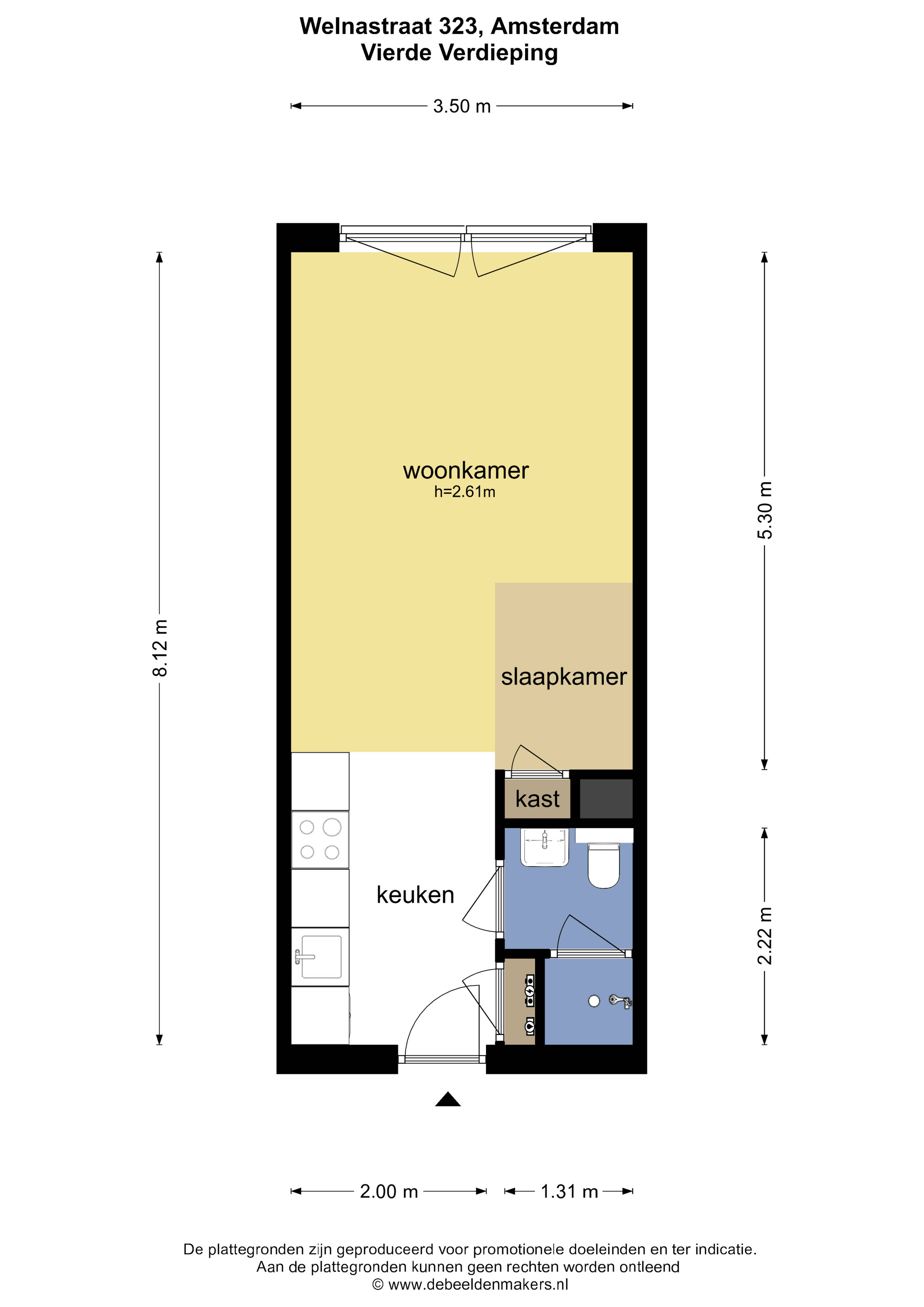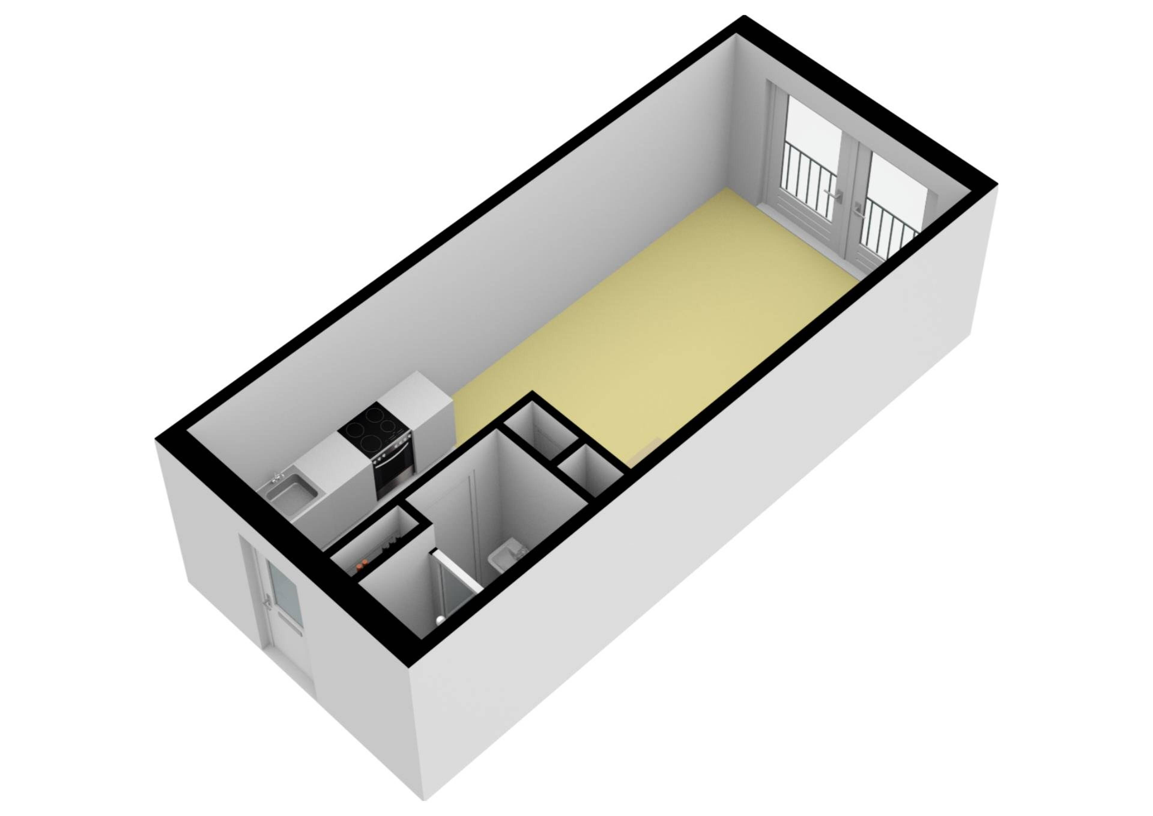 Vanuit de centrale hal met brievenbussen en bellentableau op de begane grond bereik je het trappenhuis met liften. Het appartement is gelegen op de vierde verdieping. Via de voordeur betreed je de keuken van de woning, met aan de linkerzijde de meterkast en de badkamer. De moderne badkamer is uitgerust met een wastafel, douche en zwevend toilet. De luxe keuken beschikt over een koelkast met vriesvak, combi-oven, keramische kookplaat, afzuigkap, wasmachine en vaatwasser. De woning is afgewerkt met een nette laminaatvloer welke voldoet aan de geluidsnormering en is voorzien van vloerverwarming. De studio is verder voorzien van een videofooninstallatie en een glasvezelaansluiting voor telefoon en data. In de kelder is een afsluitbare fietsenberging aanwezig met twee eigen fietsparkeerplekken. Daarnaast zijn er gezamenlijke loggia's, dakterrassen en een grote binnentuin om te relaxen, alleen of met medebewoners en vrienden.