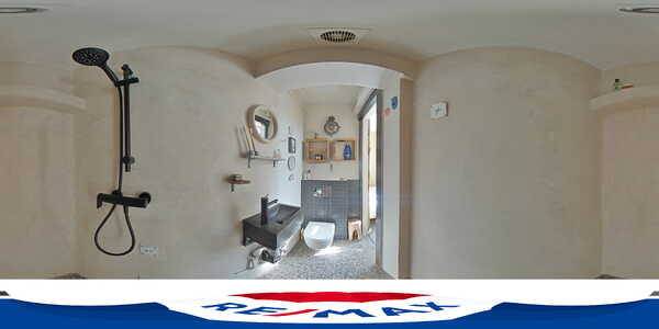 De badkamer is behalve compact zeer compleet en stijlvol ingericht. De muren van beton ciré, in een zandkleur geven echt een vakantiegevoel samen met de italiaanse terazzo tegels, op de vloer. Zwarte inloopdouche met passende zwart natuurstenen wastafel en kraan.