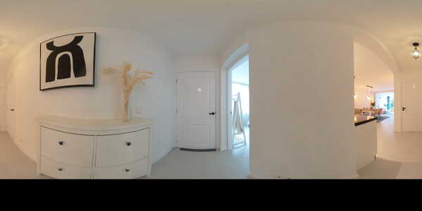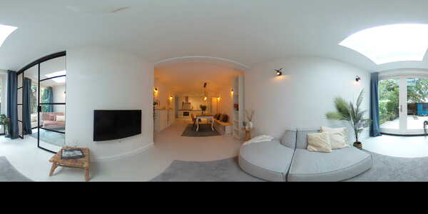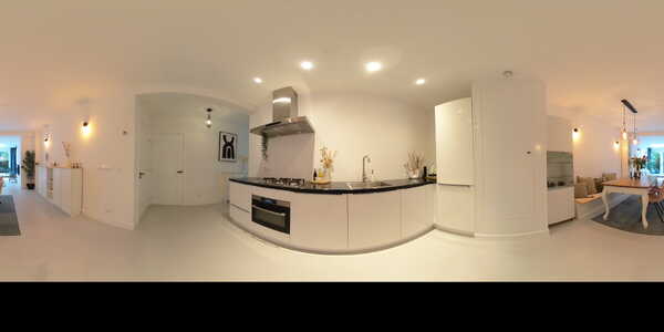 The covered main entrance gives access to this modern ground floor flat. From the hall with the meter cupboard, you step into the house. The living room is a beautiful, open space with lots of natural light thanks to the double doors to the garden and the skylights in the extension. The living room offers enough space for a living room and a dining room near the open kitchen. The sleek, white kitchen has recently been completely renovated and equipped with all modern appliances, including an AEG 5-burner gas hob, extractor hood, AEG combination oven, dishwasher and fridge/freezer. Thanks to the practical placement of the kitchen, it beautifully blends into the room. The property features ee bedroom on the street side. The bedroom is wonderfully spacious and with its beautiful stained-glass windows particularly attractive. On the garden side, a second, garden-oriented bedroom/study can be created. The luxurious, new bathroom is tiled in neutral colours and equipped with a walk-in shower, bathtub, toilet and washbasin with double washbasin. The washing machine connection is neatly hidden in a built-in cupboard in the hallway. There is a sleek, luxury cast floor throughout the flat and the entire house has comfortable underfloor heating.