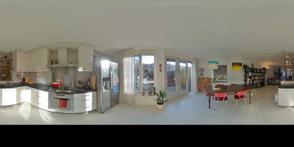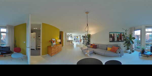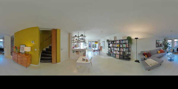 In de ruime door-zon woonkamer tref je een lichte gelakte houten vloer (met vloerverwarming), gestucte gladde wanden, en veel natuurlijk daglicht inval. Een prettige verhouding tussen zithoek en de open keuken met eettafel.