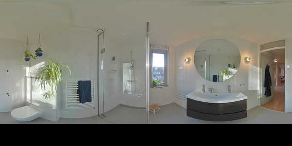 Deze badkamer is 6 jaar geleden volledig vernieuwd, net als de toilet beneden. Met veel licht en ochtendzon door het raam aan de achtertuin-zijde, grijze (MOSA-) tegelvloer in combinatie met witte afwisselend glanzende en matte wandtegels oogt de badkamer ruim en licht. Een zwevend toilet, dubbele wastafel met lades, supergave ronde spiegel en karakteristieke wandlampjes bieden veel ruimte en sfeer. De glazen douchecabine is onderhoudsvriendelijk en strak. Er is, naast vloerverwarming, een handdoek-radiator.