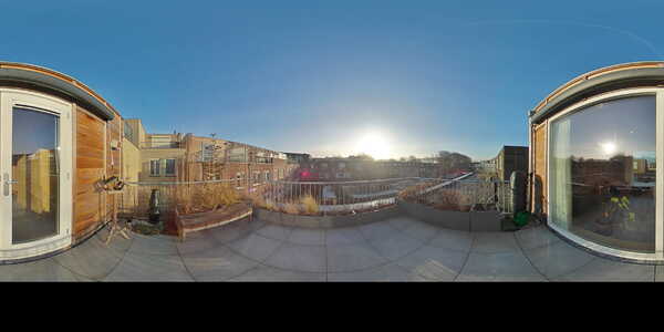 Het ruime en zonnige dakterras is voorzien van grijze keramische tuintegels, met rondom plantenbakken, waardoor je in de zomer omsloten bent door bloeiende bloemen en planten. Er is een bewateringssysteem op de tuinkraan aan te sluiten. Ook hier is een regenton. Aan de voorzijde is een onderhoudsvriendelijk sedum dak. Het is hier echt genieten van zon, uitzicht en rust.
