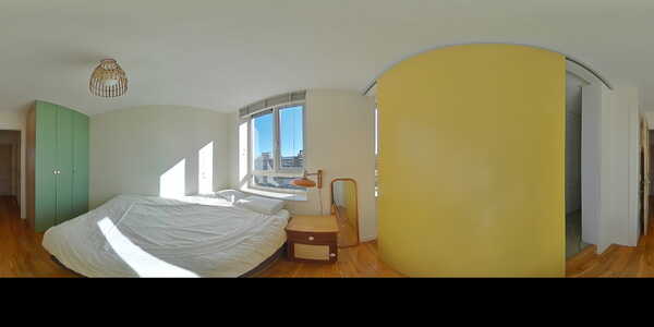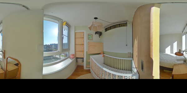 The bedroom has a partition and is ideal for relaxing. In addition, it offers access through ensuite doors to a bathroom and nursery. This can be used as a laundry room (washing machine connection available), walk-in closet or office.