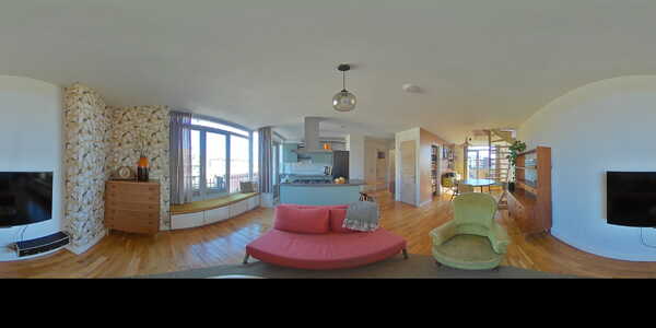 The deep living room with open kitchen offers plenty of natural light thanks to the high windows. In addition, you are provided with enough space here to socialize, lounge and dine. The living room also leads to a second floor.