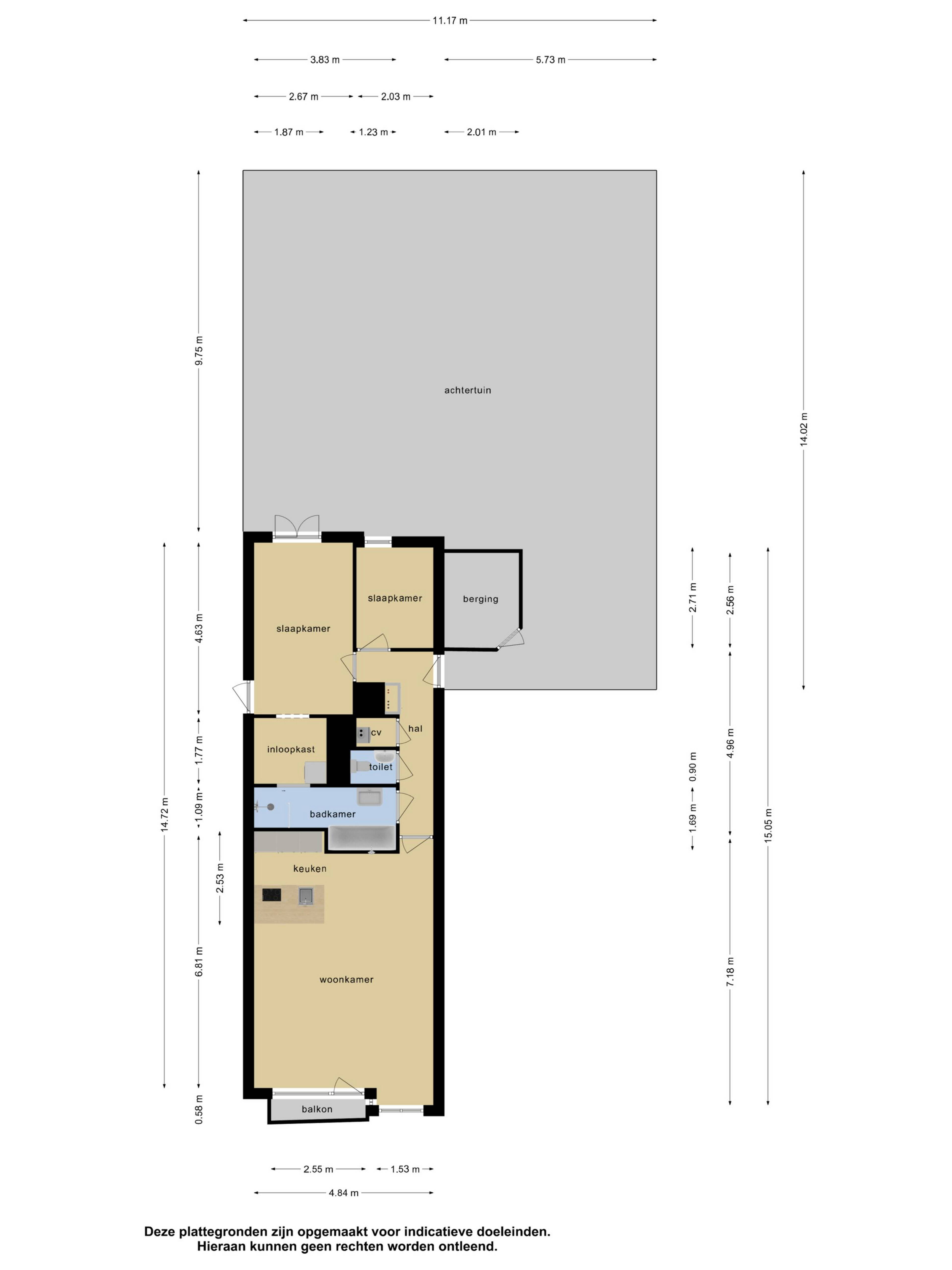 Het appartement is via een hofje te betreden van waaruit je binnenkomt in een hal. Deze hal leidt naar twee slaapkamers, een separaat toilet, badkamer en woonkamer.