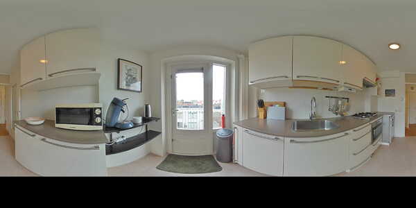 - Moderne keuken met diverse inbouwapparatuur en toegang tot balkon met uitzicht op de molen van Brouwerij het IJ en het rustieke straatbeeld