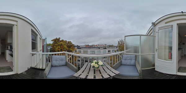 Het balkon is een aangename buitenplek waar je even tot rust kunt komen en genieten van het uitzicht op op de molen van Brouwerij het IJ.