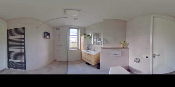 Aan de overloop, daar beginnen we. Vanaf hier ontvouwen zich drie slaapkamers, ieder badend in het licht door de grote raampartijen. De parketvloer met hoge plinten zorgt voor eenheid in stijl en klasse. De badkamer omschrijven als luxueus is geen overstatement. Moderne lichte plavuizen, vloerverwarming, inloop regendouche en een stijlvol wastafelmeubel met een hoge kast. Het aanwezige raam zorgt voor licht en die extra frisse lucht na een hete douche.