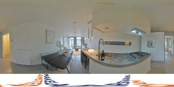 De moderne leefkeuken is voorzien van alle benodigde inbouwapparatuur. Een gasfornuis met afzuigkap, ingebouwde koelkast, vaatwasser, combi-oven en spoelbak maken koken een waar genoegen. Het eiland met zitgedeelte biedt extra functionaliteit en gezelligheid. De betonlook van het aanrecht geeft de keuken een luxe uitstraling.