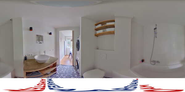 In de moderne badkamer tref je stijlvol tegelwerk, een bad-douchecombinatie van het merk Villeroy & Boch, een wastafelmeubel met waskom en een hangend toilet. Ook is er een handige ruimte gecreëerd voor de wasmachine en droger.