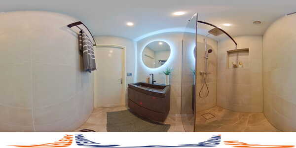 De moderne badkamer is voorzien van een luxe inloop-regendouche, inbouwsnis en natuurstenen wastafel met een passende wastafelmeubel en ventilator met timer.