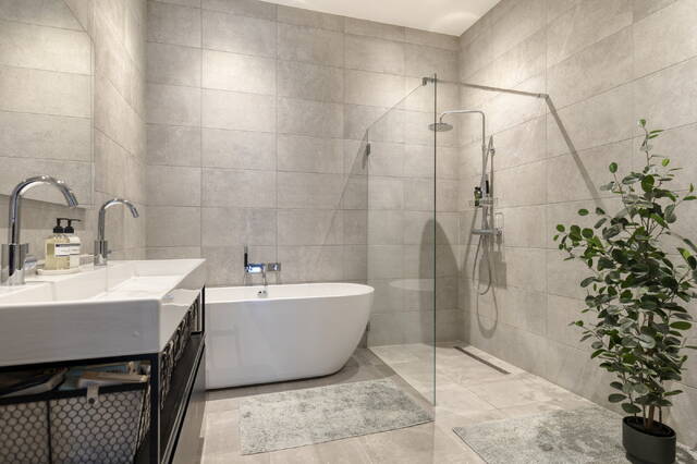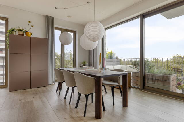 The three-metre-high windows create an impressive sense of space and flood the home with natural light. From the large east-facing balcony you can enjoy views over the city and surrounding greenery – a view that surprises every day. Whether it’s your first morning coffee in the sun or a breath of fresh evening air, this balcony feels like an extension of your living room.