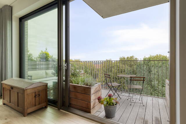 De drie meter hoge ramen geven de woning niet alleen een indrukwekkend gevoel van ruimte, maar ook een overvloed aan daglicht. Vanaf het grote balkon op het oosten kijk je uit over de stad en de groene omgeving, een uitzicht dat elke dag weer verrast. Of je nu ’s ochtends je eerste kop koffie drinkt in de zon of ’s avonds nog even de frisse lucht opsnuift, dit balkon voelt als een verlengstuk van je woonkamer.