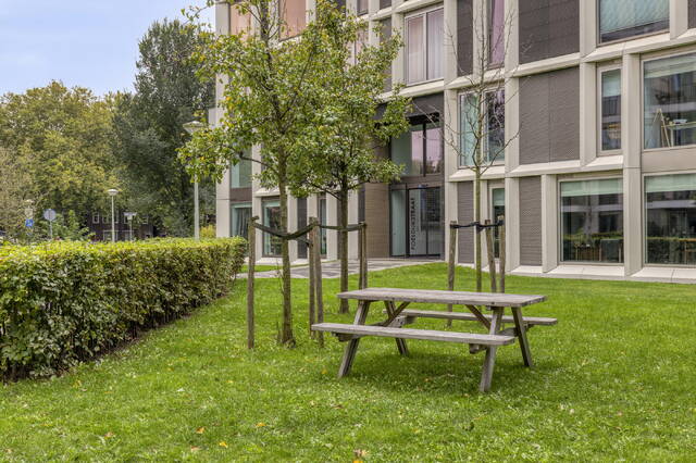 Rondom het gebouw vind je volop groen. De moestuin en de tuinen zijn gezamenlijk eigendom van de drie gebouwen, waardoor er een gevoel van verbondenheid en gemeenschap ontstaat. Hier kun je genieten van de rust van de natuur zonder afstand te doen van het gemak van de stad. Het is de perfecte balans: levendig wonen in Amsterdam, maar toch de stilte en ruimte om je heen.