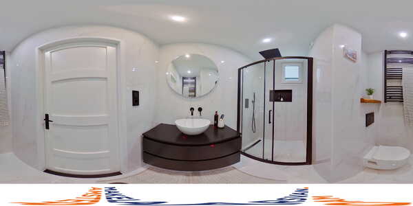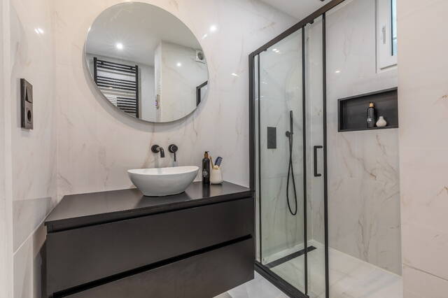 The bathroom has been stylishly renovated with marble-look wall and floor tiles and includes