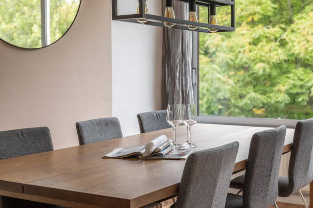 De woonkamer en eetkamer vormen samen een lichte doorzonruimte met grote raampartijen