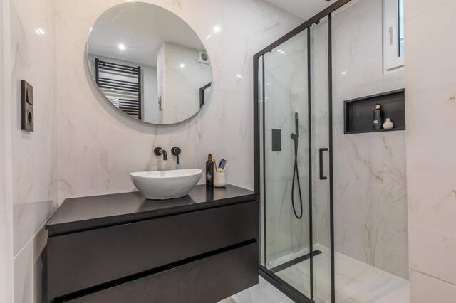 een luxe inloop-regendouche, een natuurstenen wastafel met bijpassend meubel, inbouwnis