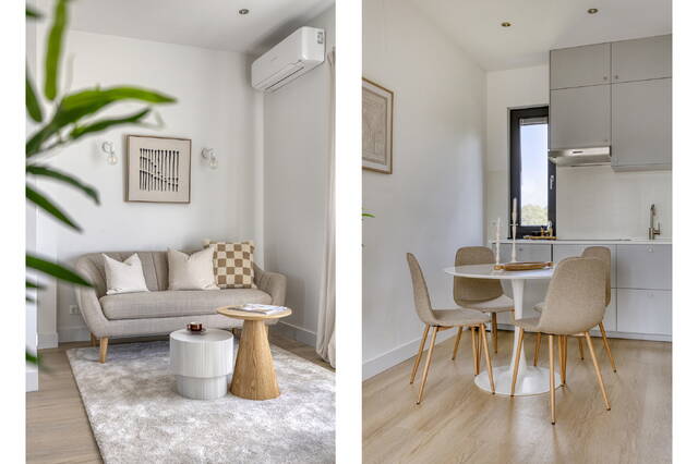 The kitchen is fully equipped with modern appliances, and the bathroom is neatly finished in a contemporary style. Situated on the top floor, the studio offers peace and privacy. Extras such as air conditioning ensure additional comfort during warmer days.