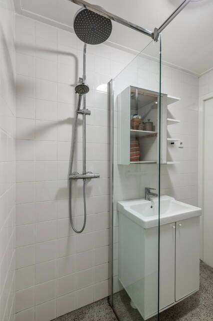 You enter the apartment through the hallway. At the front of the apartment is the bedroom, bright and quietly located, with windows fitted with double glazing. On the other side of the hallway is a practical storage room. At the end of the hall, you will find the bathroom, complete with a sink, spacious shower, toilet, and a washing machine.