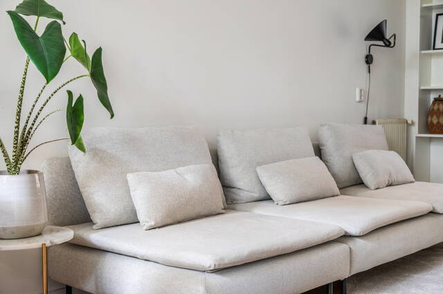 From the hallway, you enter the living room. This bright and spacious area features an open kitchen and a cozy dining corner. The kitchen is fully equipped with built-in appliances, including a dishwasher, combination oven/microwave, and gas hob, making it perfect for preparing a full meal. The double doors provide access to the backyard, which can be seen as an extension of the living area. The garden is ideal for escaping the hustle and bustle of the city.