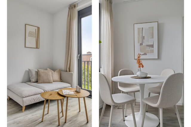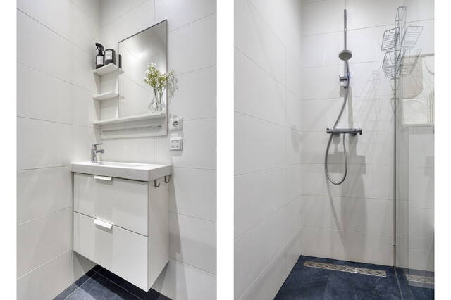 The kitchen is compact and practical, equipped with essential appliances. The bathroom is neatly finished with a shower, sink and toilet. On the same floor, residents have access to a shared laundry room with a washing machine. The apartment also features mechanical ventilation, ensuring a comfortable and healthy indoor climate.