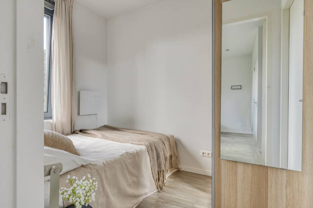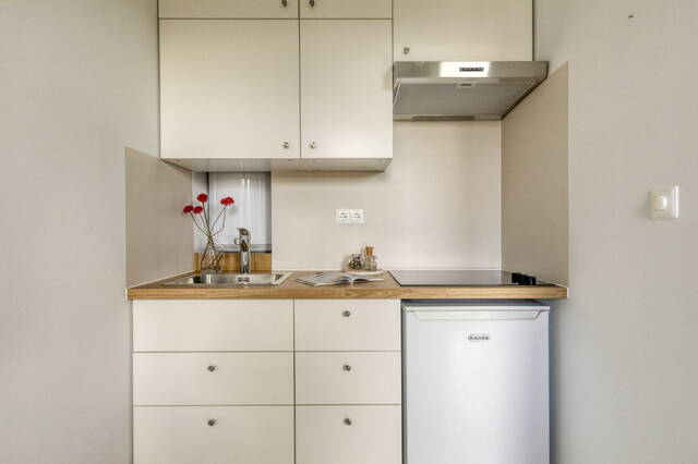 Bij binnenkomst valt meteen de lichte en open sfeer op. De studio is slim ingedeeld, waardoor de beschikbare ruimte optimaal wordt benut. De woonruimte heeft een prettig lichtinval en biedt toegang tot een Frans balkon, ideaal om de deuren open te zetten en een frisse bries binnen te laten.