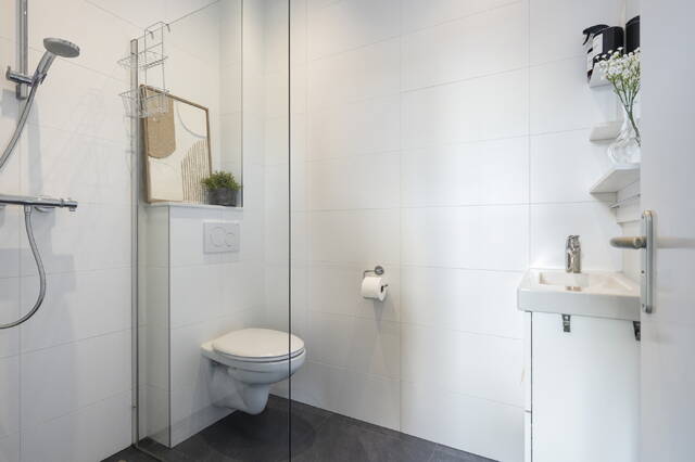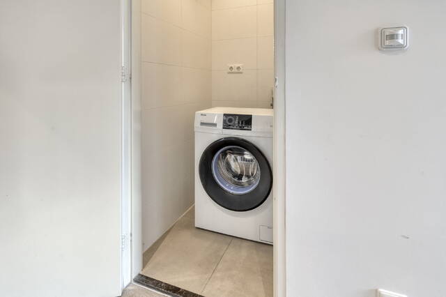 De keuken is compact en functioneel, voorzien van basisapparatuur. De badkamer is netjes uitgevoerd met douche, wastafel en toilet. Op de eerste verdieping bevindt zich bovendien een gezamenlijke wasruimte met wasmachine, exclusief voor de bewoners van deze etage. De woning beschikt verder over mechanische ventilatie, wat bijdraagt aan een comfortabel en gezond binnenklimaat.