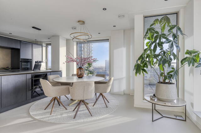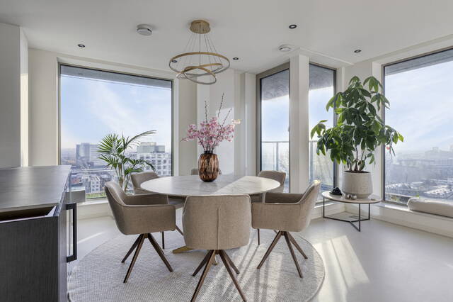 Gelegen op de 13e verdieping van het duurzame en recente Vertical East (2023), voelt dit hoekappartement direct bijzonder. Het eerste wat opvalt? Het enorme glasoppervlak en het indrukwekkende uitzicht dat zich uitstrekt van Schiphol tot Amsterdam-Noord. Overdag zie je de stad leven, ’s avonds verandert alles in een zee van licht.