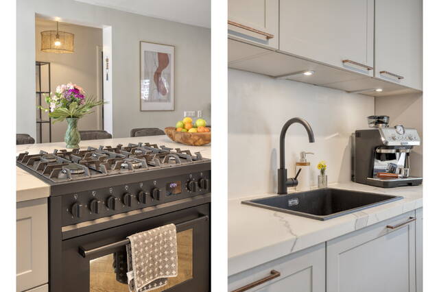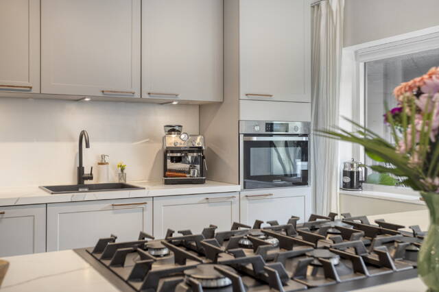 Centraal in de woning ligt de moderne open keuken met groot kookeiland en hoogwaardige inbouwapparatuur, waaronder het stijlvolle Steel Cucine Enfasi ‘All Black’ gasfornuis. De keuken loopt naadloos over in de lichte woon- en eetkamer, waardoor een fijne, open leefruimte ontstaat voor zowel dagelijks gebruik als het ontvangen van gasten.