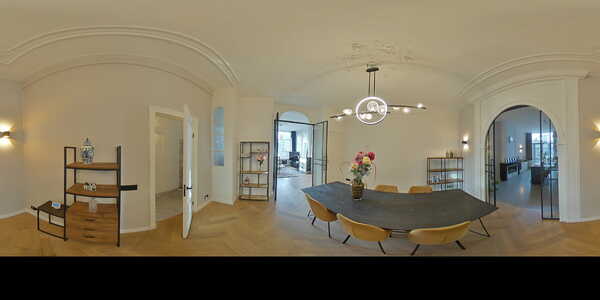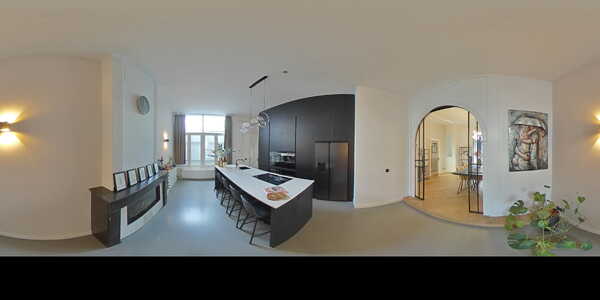 Zodra je binnenstapt, valt je oog op de indrukwekkende entree: marmeren vloeren, hoge plafonds en originele ornamenten zorgen direct voor dat klassieke gevoel waar je hart sneller van gaat kloppen. Via de stijlvolle hal loop je door naar het woongedeelte, slim verdeeld in drie zones met elegante stalen deuren: een gezellige zitkamer met open haard en uitzicht op de gracht, een eetkamer met ruimte voor lange diners onder de kroonluchter, en een sfeervolle woonkeuken met kookeiland waar elke thuiskok van droomt.