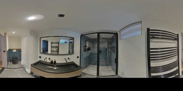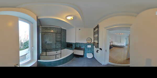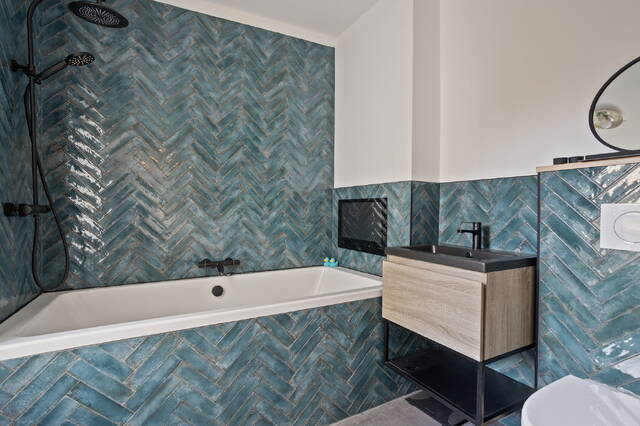 On the mezzanine level, you'll find the second bedroom with its own luxurious bathroom. Think bubble bath with built-in TV, a washbasin and toilet – your very own boutique hotel experience.