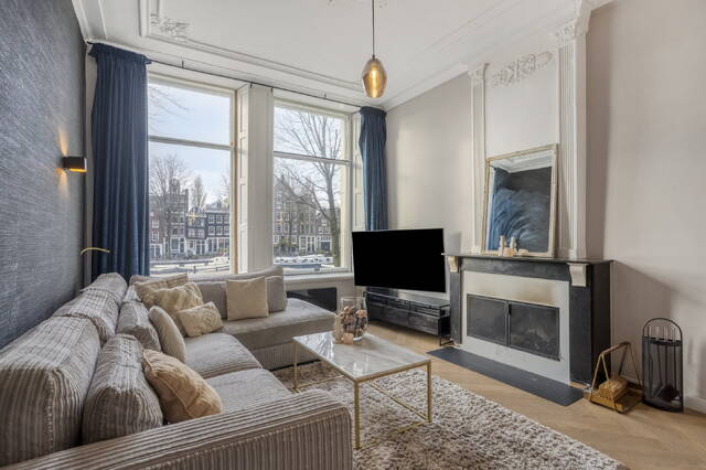 Step inside and you’ll be struck by the grandeur: marble floors, high ceilings and original ceiling ornaments immediately set the tone. The living area is cleverly divided into three parts with elegant steel and glass doors: a cosy sitting room with a working fireplace and stunning canal views, a spacious dining room fit for long dinners under a chandelier, and a large kitchen with cooking island – a dream for every home chef.