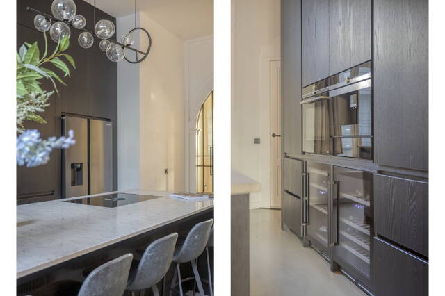 De keuken is een waar pronkstuk, voorzien van een grote Amerikaanse koelkast met ijsblokjesmachine, dubbele wijnklimaatkasten, een inbouw-koffiemachine, combi-oven, inductiekookplaat met geïntegreerde afzuiging én een Quooker. Alles straalt kwaliteit en comfort uit. Ook hier zorgt een gashaard voor sfeer en warmte.