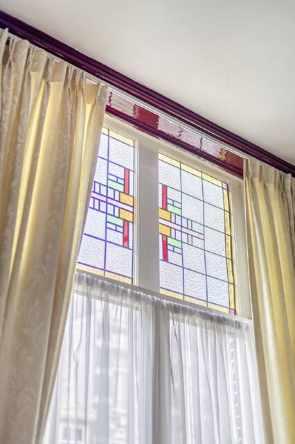 Rich character: stained-glass windows, wooden beams, original tile floor