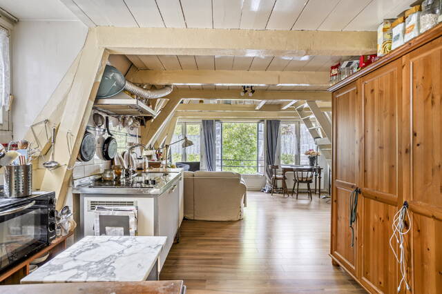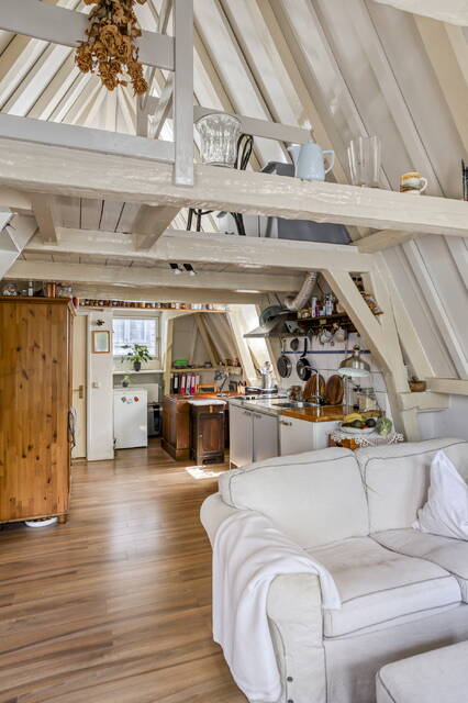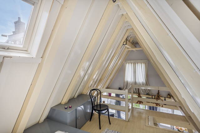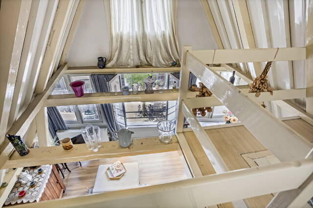 Een trap leidt naar de vide, waar het slaapgedeelte zich bevindt. Hier slaapt u in de punt van het dak, met een uniek uitzicht over de binnenstad van Amsterdam.