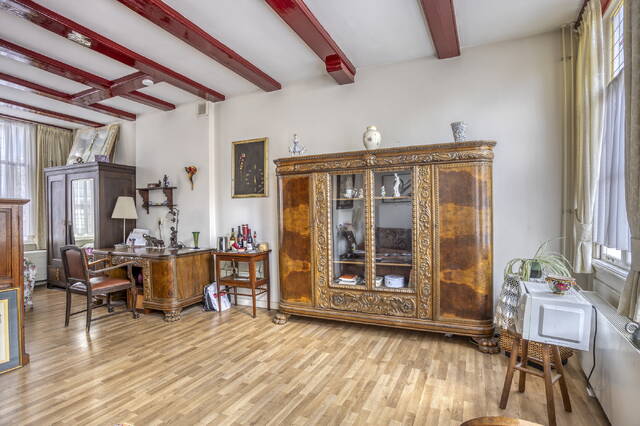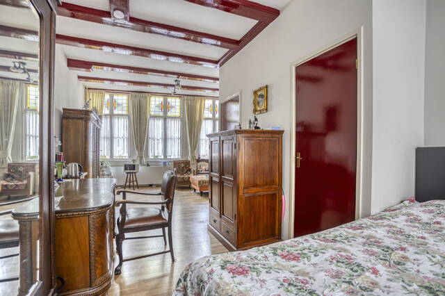 De vaste trap in de hal leidt naar de 1e verdieping, waar zich een eveneens ruime en multi-inzetbare woonlaag bevindt. De ruime, open ruimte leent zich perfect voor het inrichten van een woon- en slaapgedeelte en beschikt ook over een eigen badkamer. De hoge ramen met glas in lood en de houten draagbalken aan het plafond geven de ruimte een klassieke uitstraling, wat past bij het karakter van deze woning.