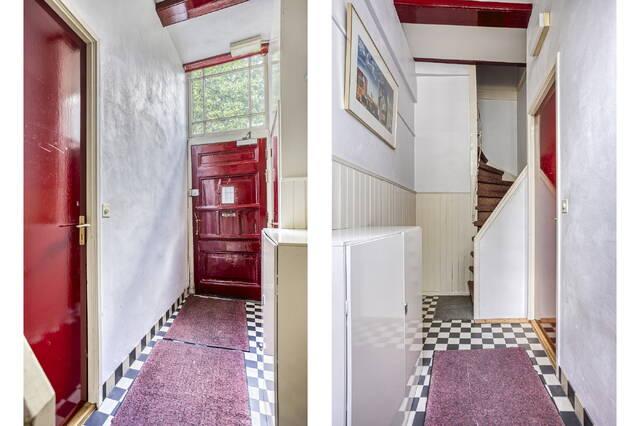 U betreedt het pand aan de straatkant, waarna u in een ruim opgezette hal arriveert. Hier zijn de karakteristieke elementen direct zichtbaar, zoals de tegelvloer en de houten draagbalken.